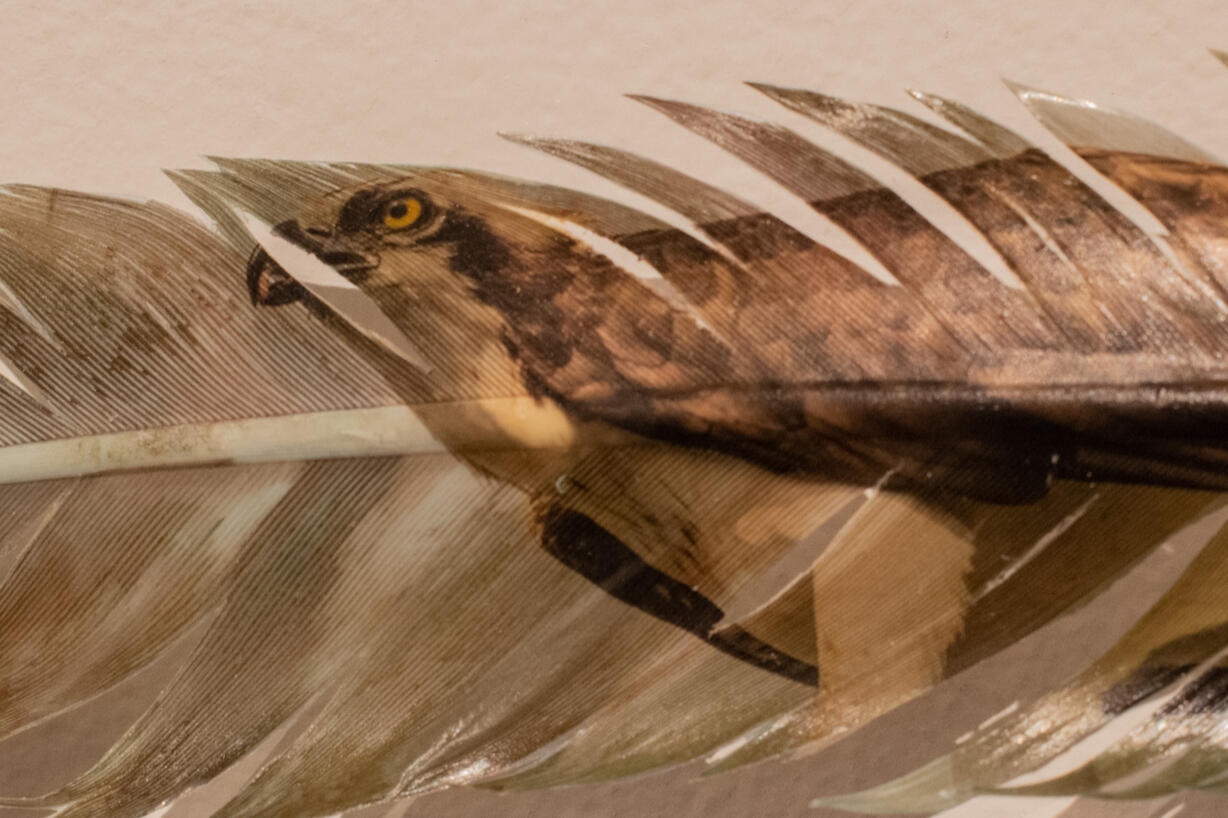 Digital photo transfers onto hand painted feather replicas of birds protected under the Migratory Bird Treaty Act. One feather donated courtesy of Susan Silber of Athena’s Wildlife Sanctuary.