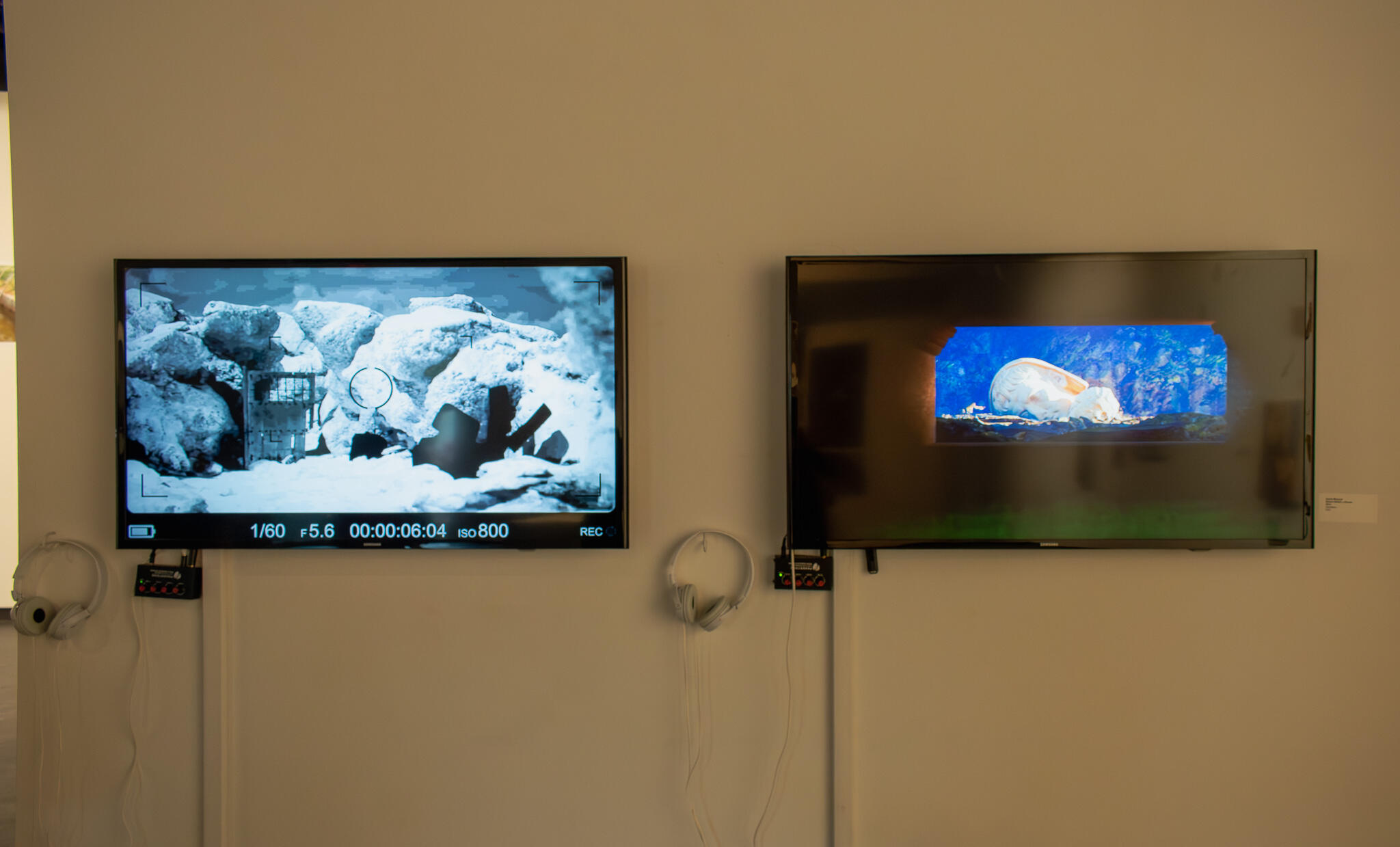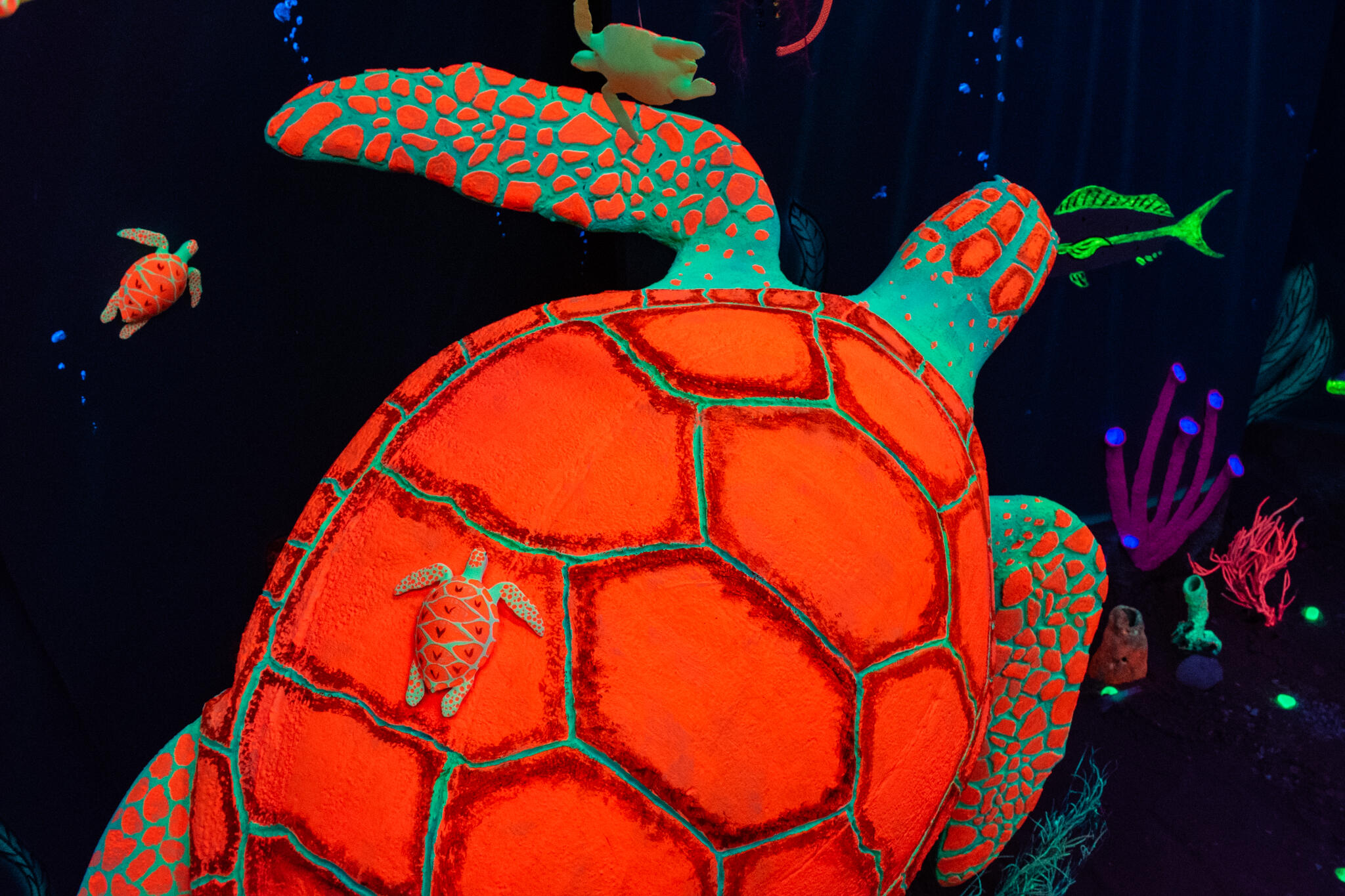 Fabric, XPS foam, acrylic paint, florescent acrylic paint, sand, acrylic orbs, stuffed animal, UV lights, fishing line, an audio file, wood. (90 sqft)
